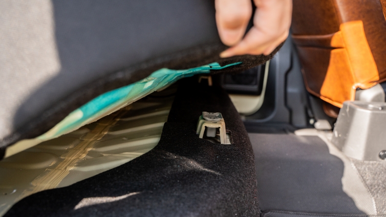 取り外した座面のシートを車外に出したら、作業ができるスペースにおいてカバーの取り付けに入ります。